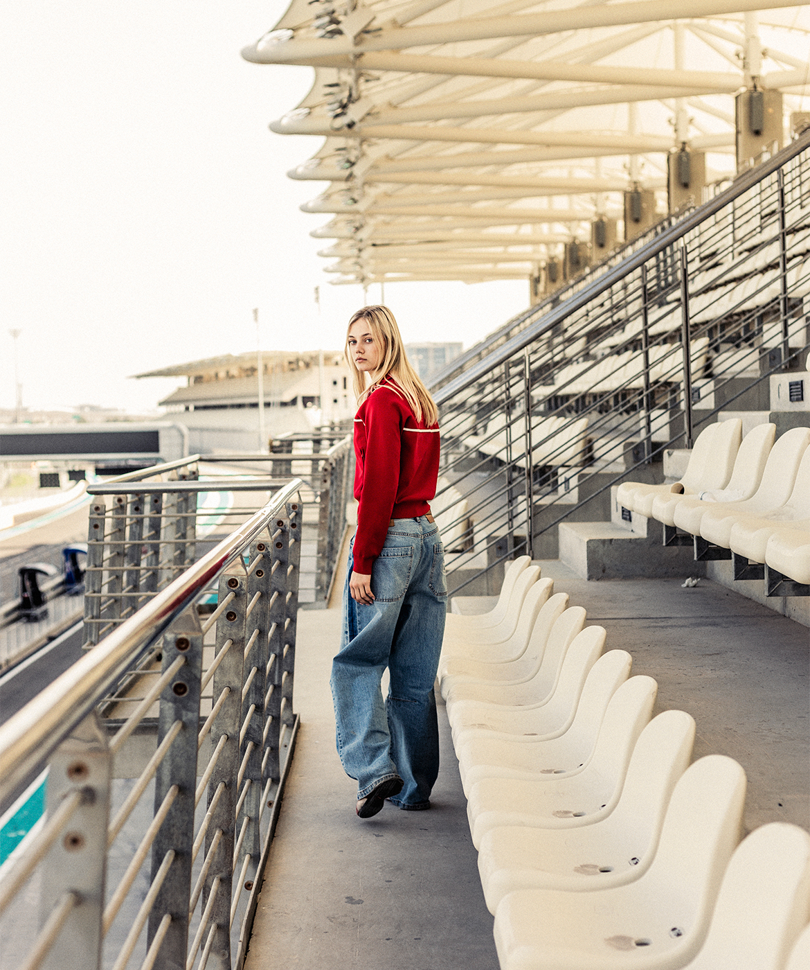 PÅ TRIBUNENS HVIDE sæder ligger et fint lag støv som påmindelse om, at vi er midt i en ørken. Alba har sat sig helt øverst og ser på, da starten går for kørerne i klassen over hende. Under halvtaget har en klump af Formel 4-kørere samlet sig i skyggen. Hun falder i snak med amerikanske Payton Westcott, som også skal køre F1 Academy i år. Ud & Se’s fotograf løfter kameraet, men Alba beder ham vente.