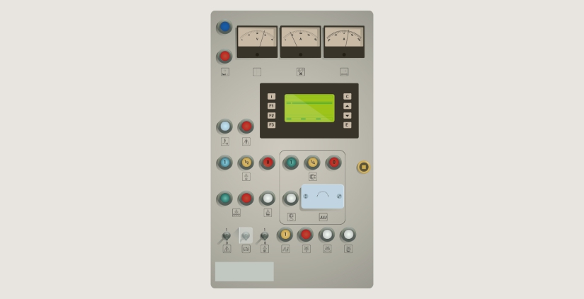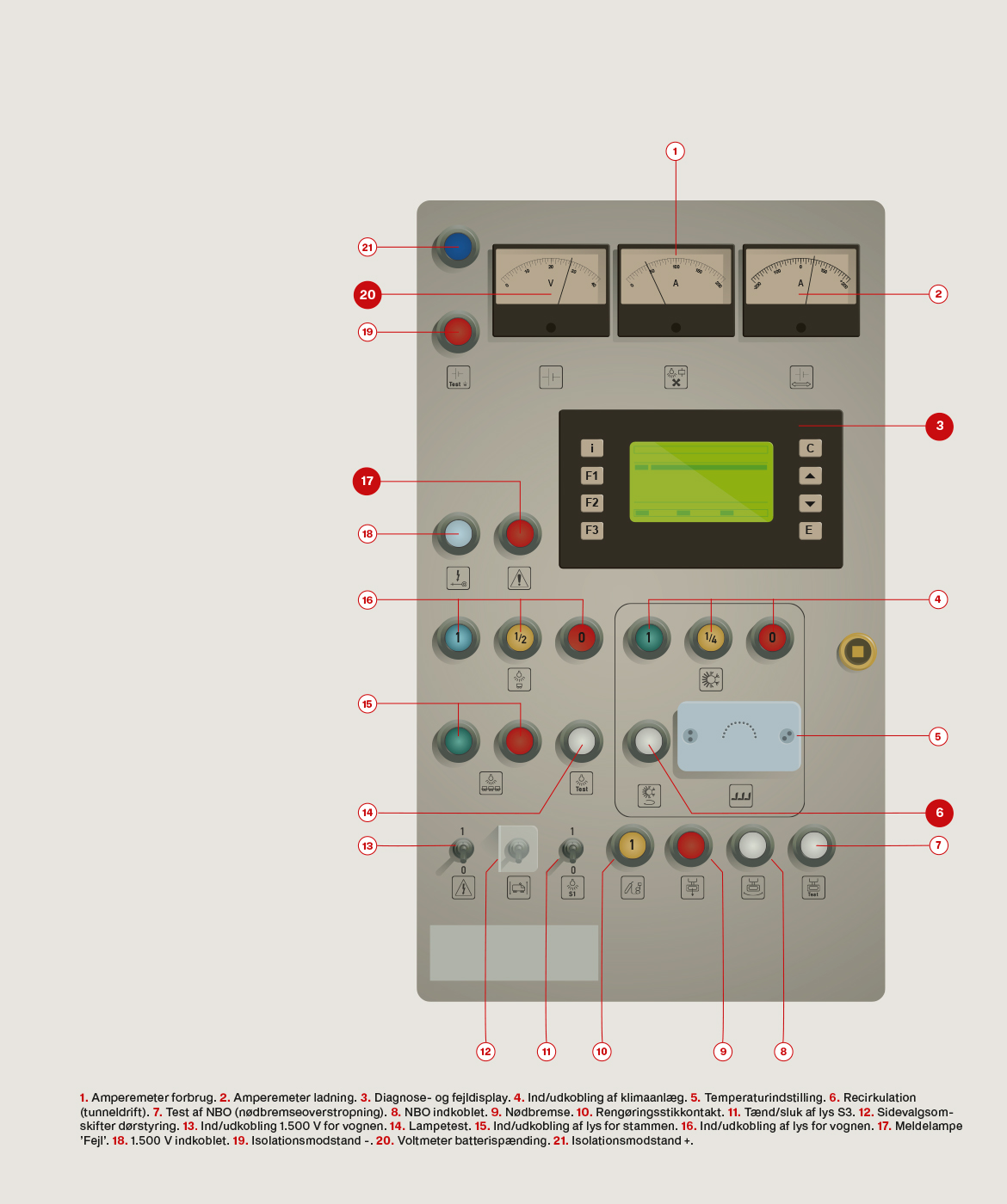 Et teknikskab i en dobbeltdækkervogn er ligesom dit el-skab derhjemme. Her kan togføreren gennem glasruden se, hvordan toget har det, hvilke funktioner der er tændt, hvilke der er slukket, og hvor meget ’strøm’ der er på batteriet. Et så stort tog har mange funktioner, og der er mange knapper, der kan lyse. Her kommer fire vigtige.