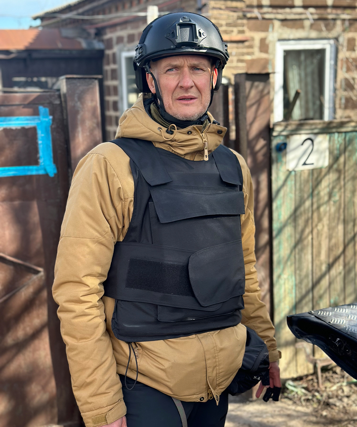Jesper Tullin med hjelm og skudsikker vest.