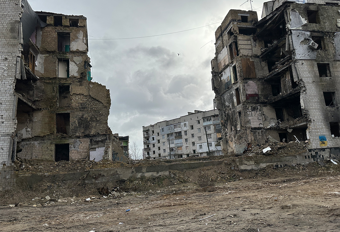 Udbombede bygninger i Butja.