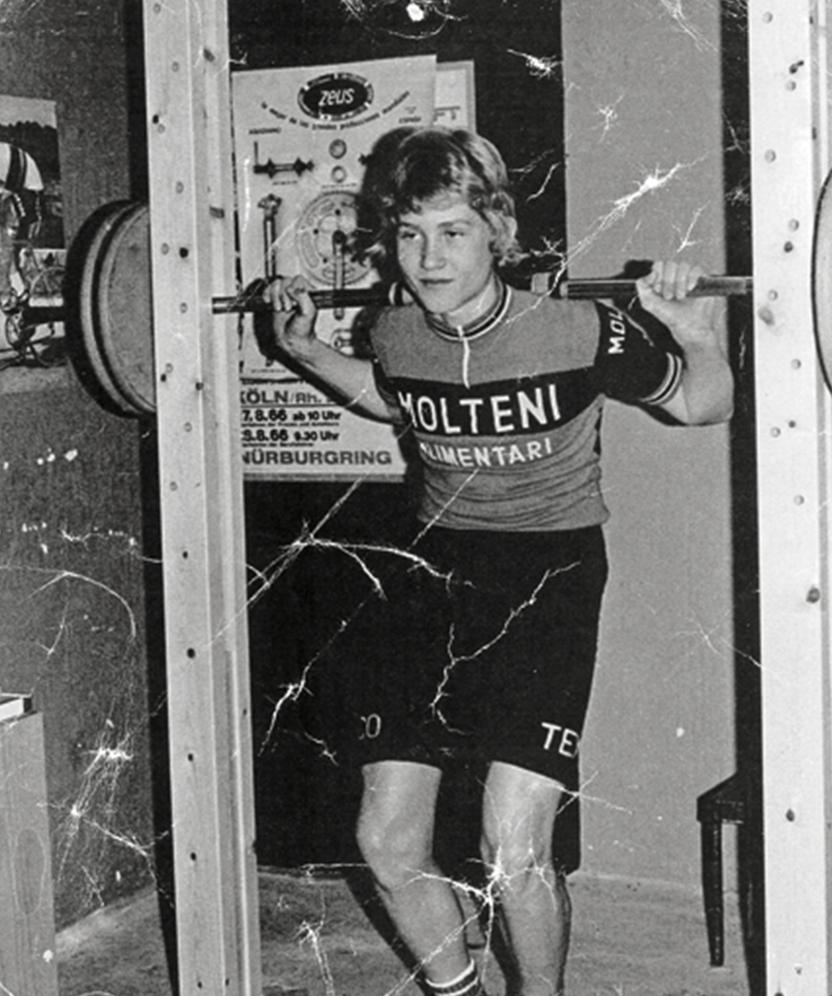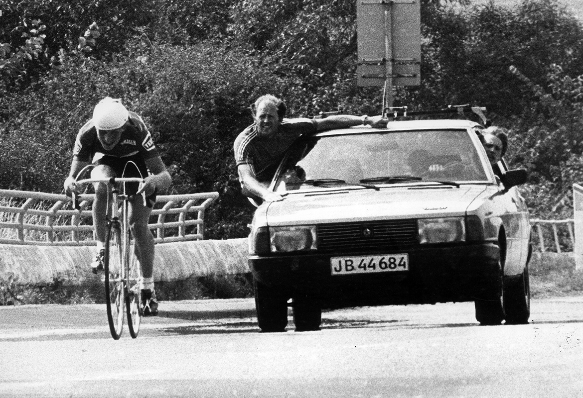 ET PAR ÅR EFTER købte min far en cykel til mig. En hvid Peugeot med skærme på. Det var ikke rigtig nogen racercykel, men den havde gedebukkestyr, og så var det en racercykel. I 1971 blev jeg meldt ind i Amager Cykle Ring. Min far gik på det tidspunkt på Neptun Allé og murede for nogle, der hed familien Madsen. Deres drenge kørte cykelløb, og af dem fik jeg en cykelkasket og et par cykelbukser med hul i. Jeg begyndte så at køre løb, men min mor ville ikke have, at jeg tog skærmene af cyklen, fordi jeg også brugte den til hverdag, og så blev jeg jo beskidt. Så jeg kørte løb med dynamolygte på forskærmen. Det var der sgu ikke meget race over.