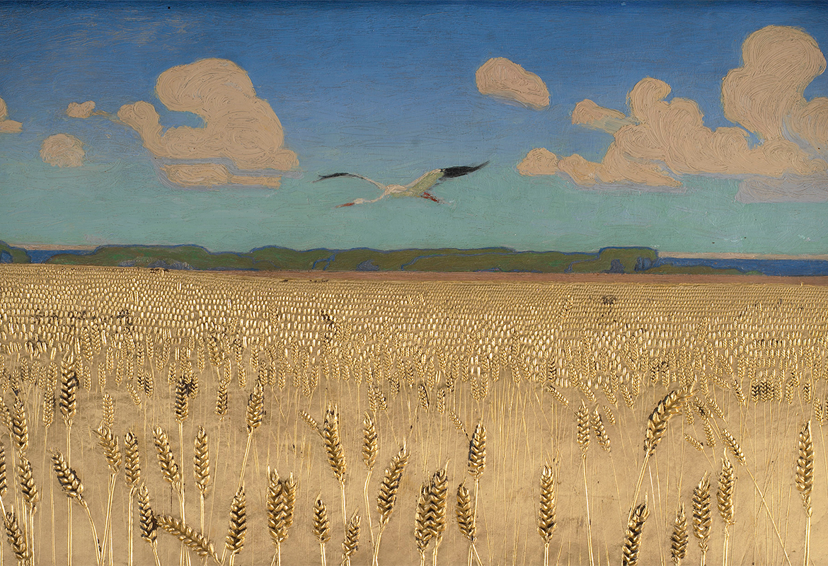 Storken er en dejlig flyver, mente Harald Slott-Møller åbenbart også. Den danske maler og keramiker, der her har givet sit bud på et typisk dansk sommersceneri, er blot en af 49 repræsenterede kunstnere på SMK Thys store udstilling om landskabsmaleri, der spænder fra snedriver af Edvard Munch over J.F. Willumsens berømte bjergbestigerske til abstrakte bjerglandskaber af Lene Adler Petersen.