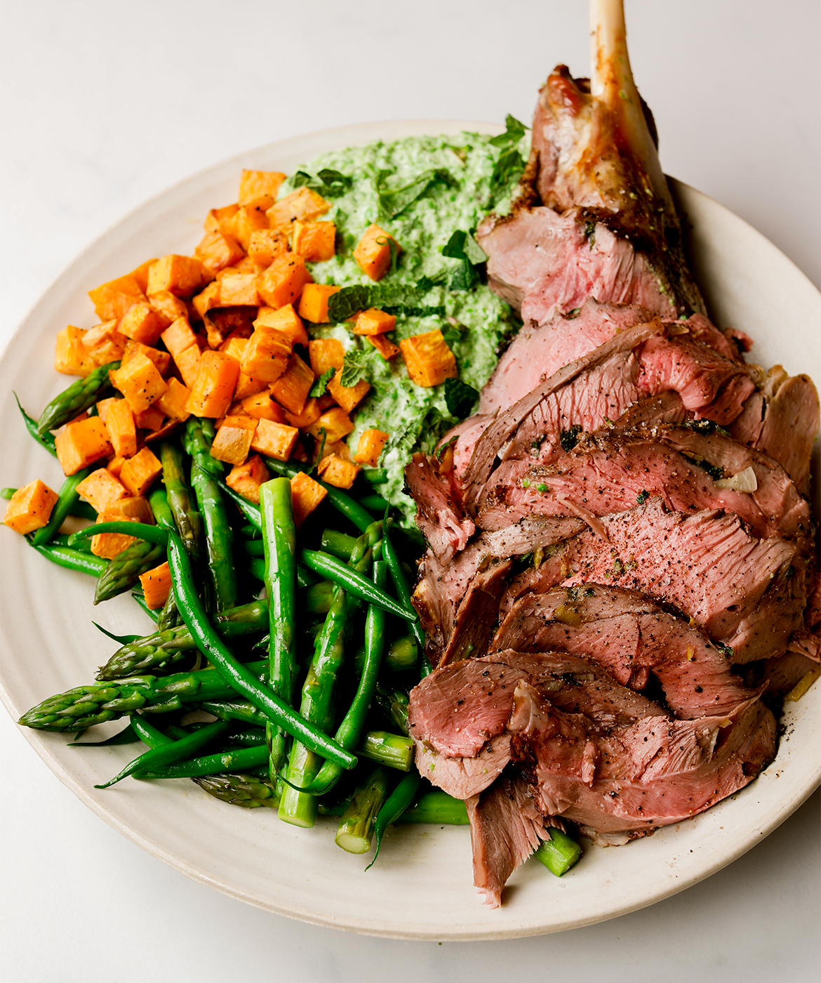 Skær lammekøllen i tynde skiver, og servér dem på et stort fad sammen med tern af sød kartoffel, grønt og ærtepuré.