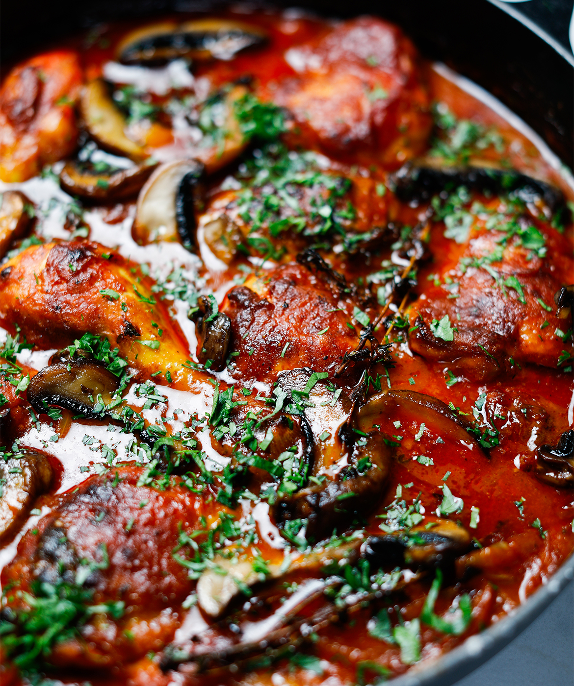 Tag panden ud af ovnen, og smag sovsen til med salt, peber og evt. lidt hvidvinseddike. Top med svampe og finthakket persille.