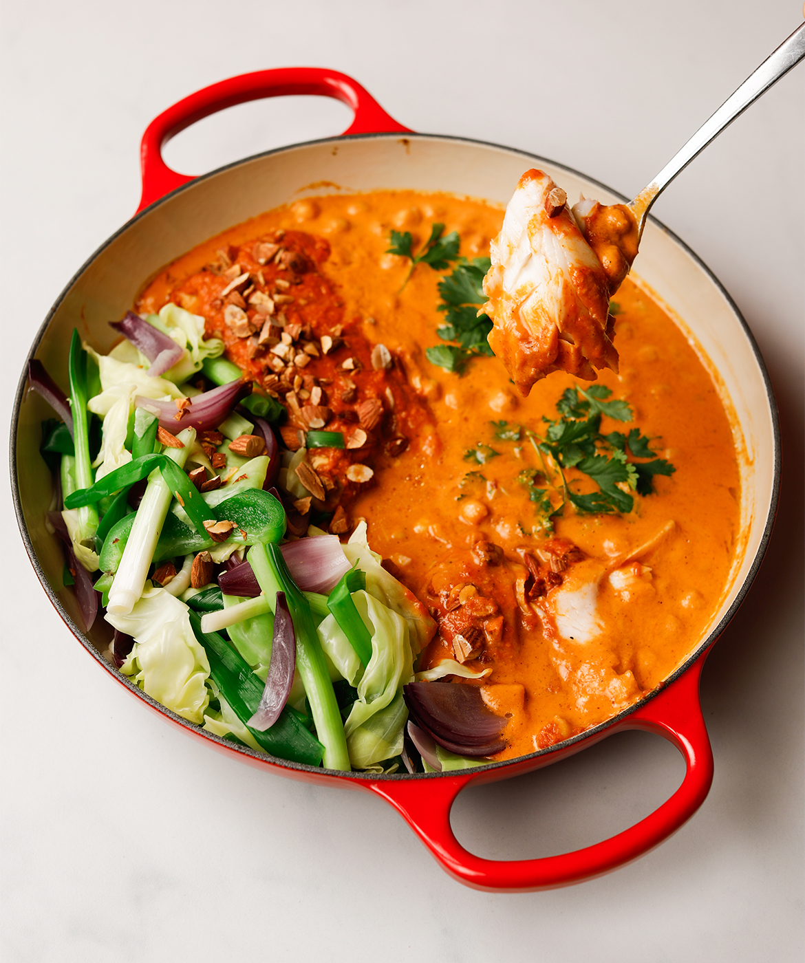 Varm resten af sovsen op med kokosmælk, og smag til med salt og peber. Hæld den over fisken og servér med dampet grønt, ris, kogte kikærter, hakkede mandler og koriander.