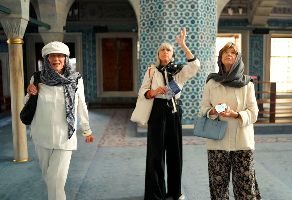 Verdensdamerne (fra venstre) Merete A. Baird, Lotte Tegner Freddie og Bente Scavenius besøger Rüstem Pasha-moskeen i Istanbul. Foto: DR