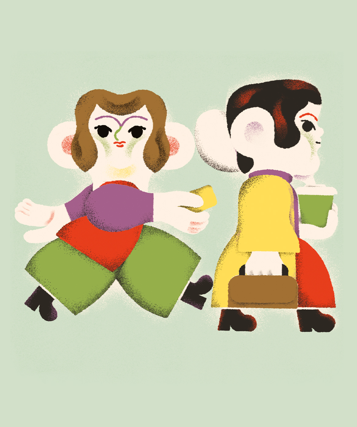 Manden i uld og tern fnyser for sig selv og vender øjne, men det tydelige kropssprog har ingen effekt, for samtalen fortsætter – nu i et mere forarget toneleje – om en flabet kollega.