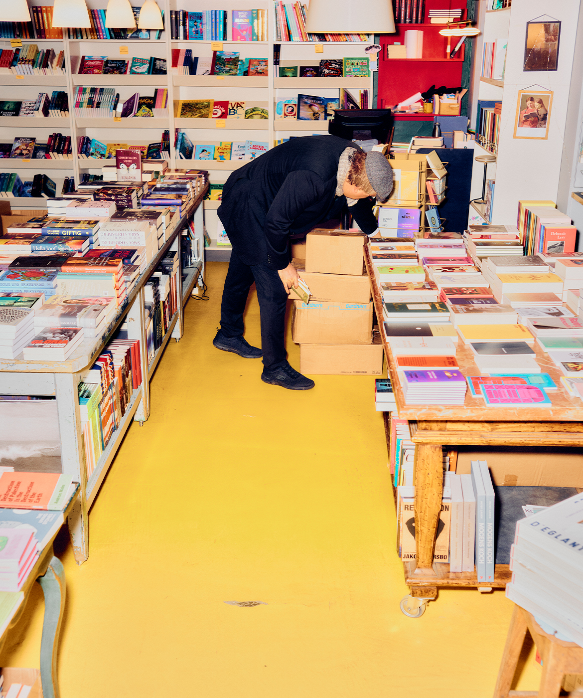 Han er nødt til at rende op og vise den unge ekspedient i bogcafeen billederne.